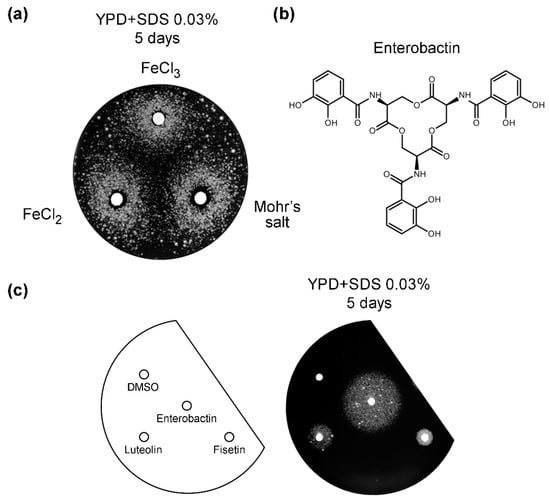 Iron salts and enterobactin restore growth of vps13Δ cells on SDS plates. (a) The vps13∆ strain was plated on YPD + SDS 0.03%. Iron salts (FeCl3, FeCl2, and Mohr’s salt Fe(NH4)2(SO4)2) were applied at 10 µL of 1 M solution per spot. Plates were incubated for 5 days. (b) Structure of enterobactin. (c) The vps13∆ strain was plated on YPD + SDS 0.03%. Enterobactin and flavonoids were applied at 10 μg per spot. Luteolin and fisetin were used as positive controls, and DMSO as negative control. Plates were incubated for 5 days.
