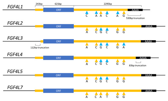 Comparison of the six full length FGF4 retrocopies identified in domestic dogs. From left to right, the letters with colored arrowheads represent variants within the 3′ UTR of the FGF4 gene at genomic locations CFA18:48,415,400A>C; CFA18:48,415,405C>A; CFA18:48,415,585A>G; CFA18:48,415,608T>C; CFA18:48,415,661G>A; and CFA18:48,416,537G>A. SNV colored in blue represent non-reference alleles. ORF, open reading frame.