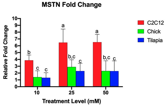 Relative MSTN fold change of gene expression of myotube cells treated with 10, 25, and 50 mM ammonium acetate compared to sodium acetate-treated cells, relative to the housekeeping gene, β-actin, for the tilapia, C2C12, and chick myoblast cells. Letters indicate a significance difference between the relative fold change (p < 0.05).