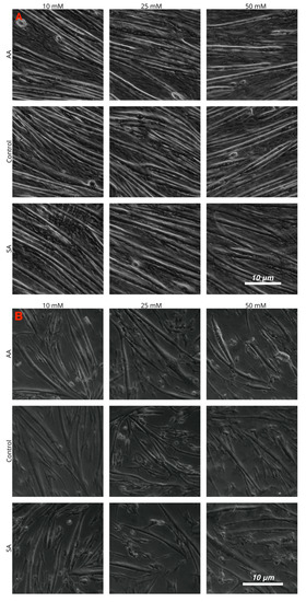 The results starting at 10 mM were consistent with previous studies for both the C2C12 and the chick cells, with increased MSTN expression for the C2C12 and lower expression in the chick, along with similar myotube diameter results [18]. Increasing the concentration of ammonium acetate to 25 and 50 mM resulted in continued high expression of MSTN in the C2C12 and a further decrease in myotube diameter as compared to the untreated and sodium acetate-treated C2C12 cells. Increased expression of myostatin has been previously linked with a decreasing myotube diameter [18,31,32]. The C2C12 cells continued this same pattern of change between the myostatin expression and myotube diameter. The higher the level of ammonium acetate, the more detrimental ammonia was to skeletal muscle growth. This pattern is also seen in patients with liver failure experiencing muscle wasting due to the high levels of ammonia in the body [33,34].