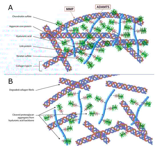 Schematic representation of cartilage extracellular matrix and its changes in osteoarthritis. (A) A healthy network of proteoglycan aggregates entangled with type II collagen fibres is seen. matrix metalloproteinases (MMPs) and a disintegrin and metalloproteinase with thrombospondin motifs (ADAMTS) cleavage sites are represented by red arrows; (B) Cartilage matrix changes in osteoarthritis defined by degradation of proteoglycans and cleavage of type II collagen fibres by ADAMTS and MMPs, respectively.
