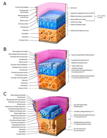 Microarchitectural and histologic changes of articular cartilage, subchondral bone and synovium in osteoarthritis. (A) Representation of normal joint structure and normal histologic state of the main tissue involved in osteoarthritis; (B) Early-stage osteoarthritis changes in articular cartilage, subchondral bone and synovium. Shallow cartilage erosions of the superficial tangential zone and middle transitional zone causing disruption of the extracellular matrix can be seen. Secondary chondrocyte hypertrophy and clustering is present as well. Changes to other joint tissues, mainly the reduction in subchondral bone mass, synovial thickening and inflammatory cells (lymphocytes) migration, together with changes in cellular activity and count, are depicted. (C) Late-stage osteoarthritis changes of involved tissues. Full-thickness cartilage erosions reaching the subchondral bone, chondrocyte apoptosis, subchondral bone sclerosis, osteophyte and subchondral cysts formation alongside vascular infiltration are shown. Further synovial thickening with immune cells infiltration and increased vascularization is also seen.