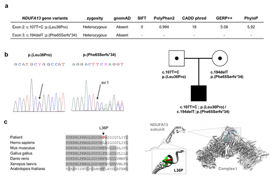 Variant analysis of the NDUFA13 gene. Panel (a) indicating the two prioritized variants in the NDUFA13 gene and some predictor scores, after the “OXPHOS panel” analysis. Panel (b) showing Sanger sequencing and family segregation of both variants. Panel (c) left side, denoting the evolutionary conservation region (gray color) where amino acid residue L36 is located in the NDUFA13 gene; red color, mutant proline residue; right side, structural analysis of p.(L36P) mutation using the HOPE program [25], representing the overlay of the wild-type and mutant (green and red, respectively) residues of the human NDUFA13 protein; the mutant residue (P) is smaller than the wild-type residue (L), while a destabilizing effect of proline was described in the α helix structures [26], which might disrupt protein–protein interactions with other structural subunits to either assemble or stabilize complex I. OXPHOS: oxidative phosphorylation.