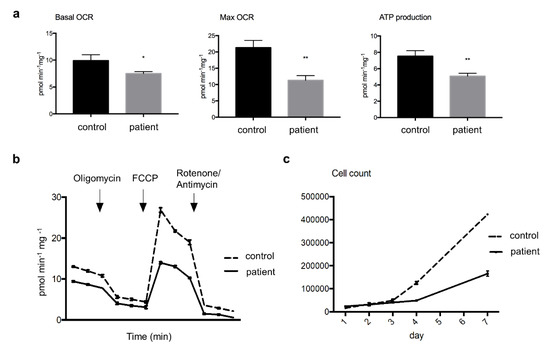 Oxygen consumption rates (OCR) and cell growth in cultured skin fibroblast. Panel (a) showing significantly lower levels of basal and maximal OCR (Mann–Whitney U-test, * p < 0.05, and ** p < 0.01, respectively), as well as of ATP production rate (** p < 0.01) in the patient’s compared to control cells; Panel (b) a representative three-replicate analysis of OCR in an XF extracellular analyzer; Panel (c) displaying slower cell growth rate in patient’s cultured cells compared to control assayed for one week. Abbreviation: FCCP, carbonyl cyanide-4-(trifluoromethoxy) phenylhydrazone.