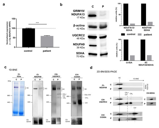 Analyses of NDUFA13 mRNA expression, NDUFA13 protein levels, and structural state of OXPHOS supercomplexes (SC) in cultured skin fibroblasts. Panel (a) NDUFA13 mRNA expression levels by quantitative q-RT-PCR on mRNA isolated from cultured skin fibroblasts of a control and the patient. Results were normalized to hypoxanthine phosphoribosyltransferase 1 (HPRT) mRNA levels and expressed as percentage of control; n = 3, error = SD. p-values were calculated by unpaired t-test. *** p < 0.001. Panel (b) Western blot showing lower levels of complex I subunits NDUFA13 and NDUFA9, in the patient’s cells compared to the control; upper right diagram, Western blot densitometric values for NDUFA13 and NDUFA9 normalized by SDHA (CII); lower right diagram, densitometric values of CI-IGA and 1D-BNE (CI-NDUFA9) normalized by SDHA (CII). Panel (c) Complex I in-gel activity (CI-IGA) assay and one-dimensional blue native electrophoresis (1D-BNE) analysis of digitonin-solubilized mitochondria from control and proband’s fibroblasts showing OXPHOS complexes I to IV (CI–CIV). Complex II (anti-SDHA) was used as a loading control. Ferritin was used as molecular mass standard (on the left of gels): monomer (440 kDa) and dimer (880 kDa); Panel (d) 2D-BN/SDS-PAGE analysis of the steady-state levels of respirasome and SC I+III2 (SC). CIII2+CIV, supercomplex containing CIII2 and CIV. CIII2, dimeric CIII. CIV2, CIV dimer. C: control, P: patient.