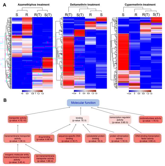 Transcriptome patterns of coding genes of sea lice exposed to pesticide drugs. (A): heatmap based on TPM(Transcript per million) calculation and hierarchical clustering on Manhattan distances with average linkage. Double clustering was applied including features (genes) and samples (strains and treated/untreated condition). Clustering on gene expression levels are indicated in the left of each heatmap, and on samples on top of each heatmap. Red colors mean upregulated coding genes, blue colors downregulated genes. R: resistant population to a specific drug, S: susceptible populations for the corresponding drug; (T) treated lice (exposed to the corresponding drug). (B): Enrichment of GO (Gene Ontology criteria) terms related to molecular functions in all the combined datasets (treated vs. untreated parasites for the three drugs). Enrichment analyses were based on p-values obtained by Fischer’s Exact Test. Red colors and mean significantly enriched GO terms.