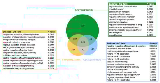 Differentially expressed genes (DEGs) were mainly modulated in lice exposed to deltamethrin. From 896 transcripts highly regulated, 609 DEGs were exclusives genes in response to this pyrethroid. Notably, GO annotations were related to nervous system categories such as interneuron migration, ion transport, axis elongation, and glutamatergic synapse (Figure 2). Furthermore, 394 genes were differentially expressed after cypermethrin treatment, where 104 DEGs were exclusively regulated. Enriched GO analysis revealed the association of cypermethrin with nervous system categories, and also with complement pathway activation, ncRNA export from the nucleus, and regulation of gene expression by miRNAs. Azamethiphos exposure triggered the regulation of 346 significant DEGs, including 119 exclusives related to interleukin-2 secretion, oxidative stress, and several related to epigenetic regulation as histone modifications.