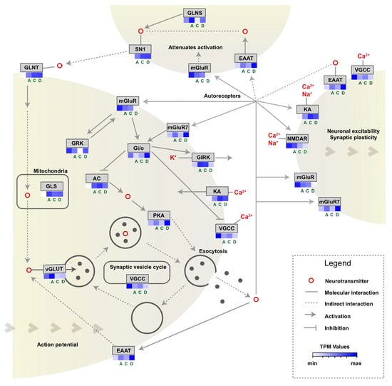 The transcriptome analysis evidenced a high number of DEGs related to the glutamatergic synapse pathway in response to drug treatments. Consequently, a more in-depth analysis to determine the molecular components of this pathway was conducted. Most of the transcripts involving the KEGG pathway for glutamatergic synapse were found at the transcriptome level. Most of these genes were upregulated after drug exposure, including key genes such as glutamate-ammonia ligase (GLNT), glutaminase-2 (GLS), ionotropic kainate receptors (KA), metabotropic glutamate receptor-7 (mGluR7), potassium voltage-gated channel subfamily J (GIRK), protein kinase A (PKA), adenylate cyclase-1 (AC), solute carrier family-1 (EAAT), and family-38 (SN1). Other negative regulators of neuronal excitability were downregulated such as the other metabotropic receptors members (mGluR), G protein-coupled receptor kinase-2 (GRK), and G protein subunit β (Gi/o), which were downregulated after azamethiphos and cypermethrin exposure, but upregulated after deltamethrin treatment (Figure 3).