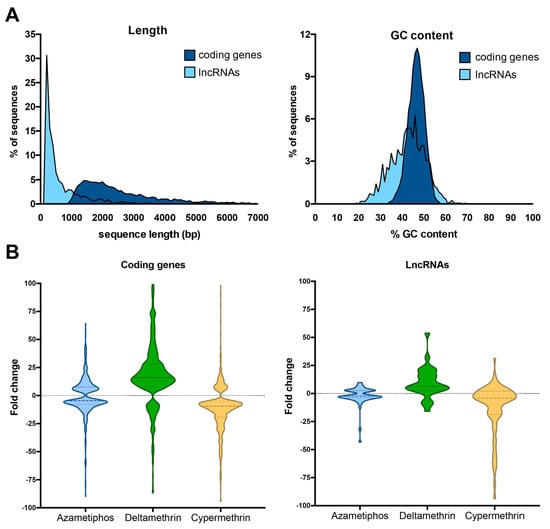 Characterization of lncRNAs in the transcriptome of sea lice exposed to pesticide drugs. (A)-left: histogram of sequence length (bp) of coding genes (blue) and lncRNAs (light blue); (A)-right: histogram of %GC content of coding genes and lncRNAs. (B): Violin plots showing the total gene expression of coding genes and lncRNAs by each treatment (considering both populations per drug). Gene expression is calculated by fold change of TPM values of each group to the control group.