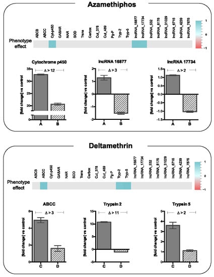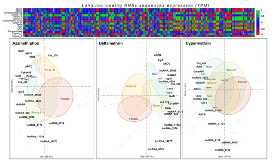 In contrast, cypermethrin treatment did not exhibit differentiation by specific gene transcription profiles. It was possible to observe that most differentially expressed transcripts of resistant lice strain to azamethiphos corresponded to lncRNAs, while the other population revealed a correlation with genes such as cuticle protein 378, super-oxide dismutase, ABCB and ABCC transporters. On the other hand, most of the selected transcripts were almost exclusively associated with the deltamethrin-resistant strain, while there was no transcription associated with the susceptible strain (Figure 6).
