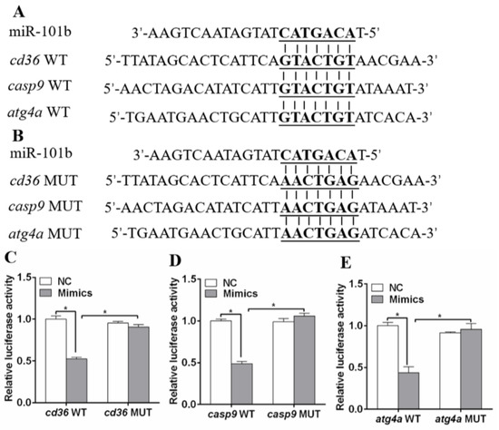 The target genes of miR-101b were validated as described in Chen et al. [15]. At first, we synthesized wild type (WT) DNA fragments of the 3′ UTRs of cd36, casp9, and atg4a containing miR-101b putative binding site, and subcloned them into pmirGLO vector (Promega, USA) with the SacI and XhoI sites. Mutant (MUT) recombinant plasmids were synthesized by overlap-PCR, and the 7 mer of miR-101b Seed Sequence was mutated to ACAGTAC.