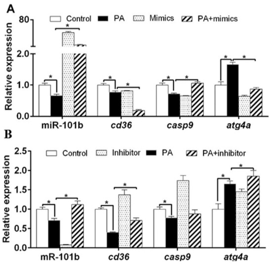 PA down-regulated miR-101b, cd36 and casp9 expression, but up-regulated the gene concentrations of atg4a (Figure 2A). Compared to PA group, miR-101b mimics and PA co-incubation up-regulated gene concentrations of miR-101b and casp9, but down-regulated of gene concentrations of cd36 and atg4a. Compared to PA group, co-treatment with miR-101b inhibitor and PA up-regulated gene concentrations of miR-101b, cd36 and atg4a (Figure 2B).
