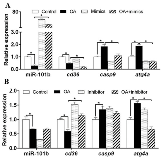 OA incubation down-regulated miR-101b and cd36 expression, but up-regulated gene concentrations of atg4a and casp9 (Figure 3A). Compared to OA group, co-treatment with miR-101b mimics and OA up-regulated miR-101b concentration, but down-regulated gene concentrations of cd36, casp9 and atg4a. Compared to OA group, co-treatment with miR-101b inhibitor and OA up-regulated expression level of cd36, but down-regulated expression level of atg4a (Figure 3B). Altogether, these results indicated that miR-101b mediated the FA-induced changes of cd36, casp9 and atg4a expression.
