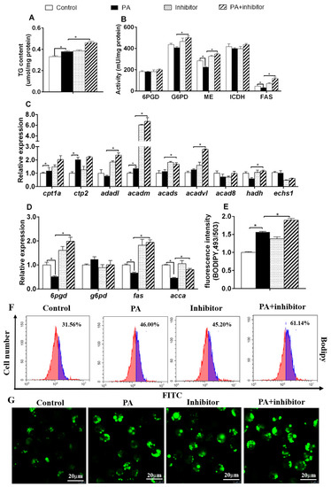 The influences of PA and miR-101b inhibitor co-incubation on lipid deposition in hepatocytes of yellow catfish. (A) TG content; (B) lipogenic activities; (C,D) mRNA expression of lipid metabolism; (E) fluorescence intensity after Bodipy 493/503 staining; (F) flow cytometric analysis of Bodipy 493/503 staining; (G) the images of Bodipy 493/503–stained LDs; Scale bars, 20 μm. Results are expressed as the mean ± SEM, n = 3. * P < 0.05 (Student’s t test).