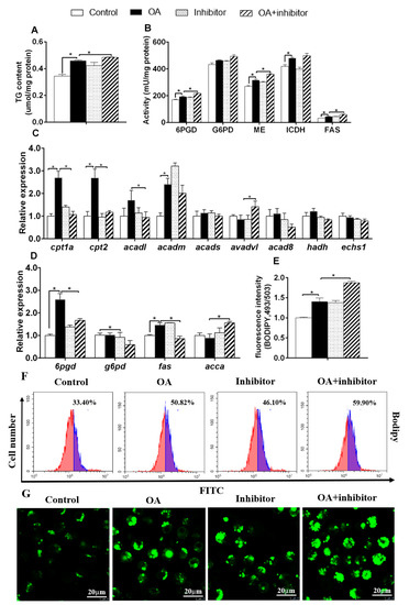 OA incubation increased TG content, up-regulated activities of 6PGD, ME, ICDH and FAS, and mRNA contents of 6pgd, fas, cpt1a, cpt2 and acadm (Figure 5A–D). Compared to OA group, miR-101b inhibitor and OA co-treatment decreased increased TG content, G6PD, ME and FAS activities, and acca and adadl mRNA expression, but decreased mRNA expression of 6pgd, g6pd and fas, together with mRNA expression of cpt1a, cpt2 and acadl. miR-101b inhibitor pretreatment also aggravated OA-induced increase of fluorescence intensity, as shown by BDIPY 493/503 staining (Figure 5E–G). Thus, miR-101b mediated OA-induced variations of lipid metabolism in hepatocytes of yellow catfish.