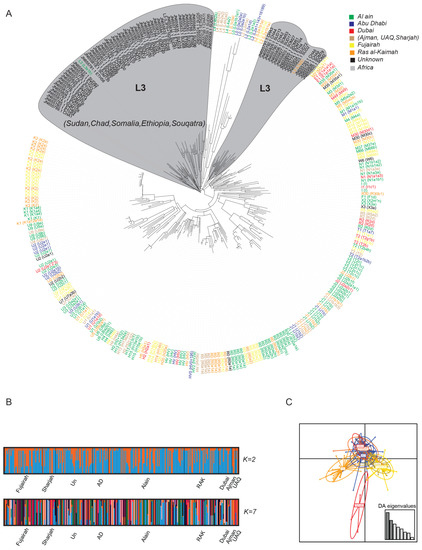 - Richards, M.; Rengo, C.; Cruciani, F.; Gratrix, F.; Wilson, J.F.; Scozzari, R.; Macaulay, V.; Torroni, A. Extensive female-mediated gene flow from sub-Saharan Africa into near eastern Arab populations. Am. J. Hum. Genet. 2003, 72, 1058–1064. [Google Scholar] [CrossRef][Green Version]