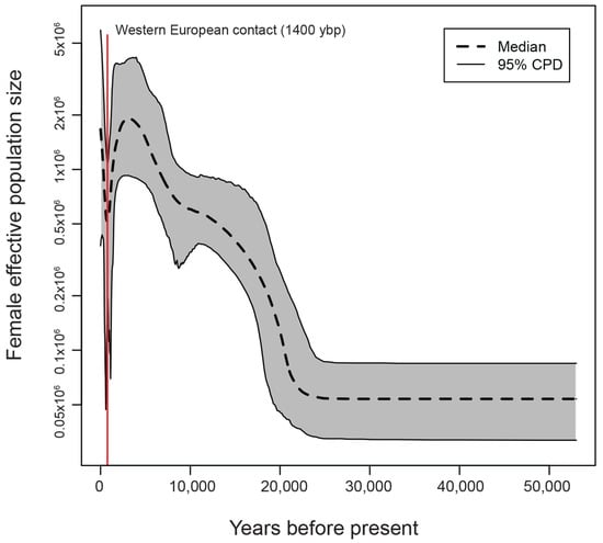 - Heled, J.; Drummond, A.J. Bayesian inference of population size history from multiple loci. BMC Evol. Biol. 2008, 8, 289. [Google Scholar] [CrossRef] [PubMed]