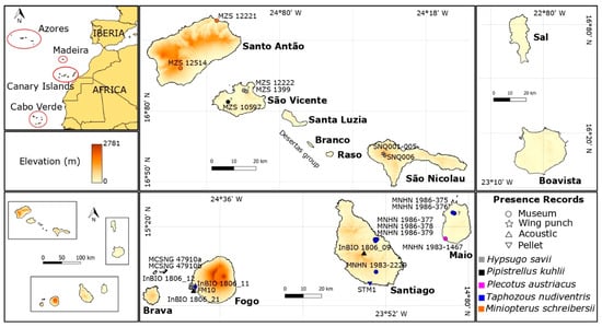 - Puccetti, M.L.; Zava, B. Nouvelles donnés sur les chiroptères des îles du Cap-Vert. Bolletino Mus. Reg. Sci. Nat. Torino 1988, 6, 603–615. [Google Scholar]