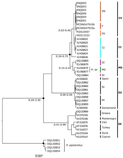 - Pestano, J.; Brown, R.P.; Suárez, N.M.; Fajardo, S. Phylogeography of pipistrelle-like bats within the Canary Islands, based on mtDNA sequences. Mol. Phylogenet. Evol. 2003, 26, 56–63. [Google Scholar] [CrossRef]