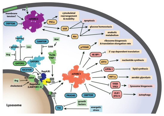 - Menon, S.; Dibble, C.C.; Talbott, G.; Hoxhaj, G.; Valvezan, A.J.; Takahashi, H.; Cantley, L.C.; Manning, B.D. Spatial control of the TSC complex integrates insulin and nutrient regulation of mTORC1 at the lysosome. Cell 2014, 156, 771–785. [Google Scholar] [CrossRef]
