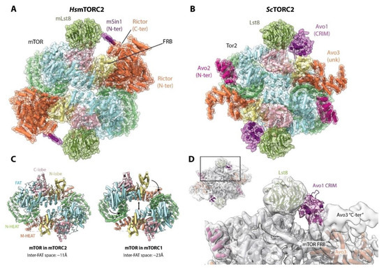 During the last three years, models derived from cryo-EM images for budding yeast TORC2 [96] and for human mTORC2 [97,98,99] have been published. Overall, TORC2 and mTORC2 share a similar topology with each other as well as with mTORC1 (Figure 7A,B). The core of mTORC2 is formed primarily by interactions between mTOR monomers, as in mTORC1. However, comparison of the mTOR dimer in mTORC2 with that of mTORC1 reveals that the adjacent FAT domains are closer to each other, and thereby, the central hole of the complex is narrower (~11Å versus ~23Å) (Figure 7C). This appears to be due primarily to the presence of mSin1/Avo1 next to the FRB domain, which, together with Rictor/Avo3, “push” the KD and FAT domains towards the other mTOR molecule.