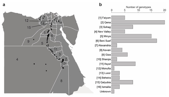 GPS coordinates of the locations where the fenugreek genotypes were collected; please refer to Table S1 for further details; (a), GPS locations plotting (numbers indicated in the map represent the Egyptian governorates from which genotypes were collected and correspond to those in the panel (a)); (a), horizontal bar-plot showing the number of genotypes of each Egyptian governorate.
