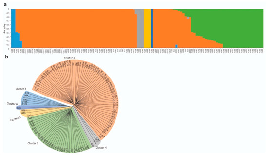 The 38,142 generated SNPs of the 112 tested fenugreek genotypes were used as an input for the fastSTRUCTURE software [32], to build an admixture model and to reveal the population structure. Testing the number of genetic clusters (K) within a range of 2–13, at Hardy–Weinberg (HW) equilibrium, the model complexity that maximizes the marginal likelihood was suggested as K = 6, while the model components that best explain structure in the data were suggested as K = 2. Additionally, the analysis revealed strong genetic structure in most of the genotypes and a moderate degree of admixture within other genotypes which appeared to be independent of their geographic origin (Figure 2a). Results obtained from the SNP-based phylogenetic analysis were consistent with the population structure, displaying two main clusters and six sub-clusters (Figure 2b). The first main cluster consisted of 66 genotypes showing strong genetic structure. The second main cluster included the other 46 admixed genotypes that were further divided into five different sub-clusters.