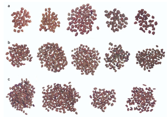 Images of the observed variation in seed length, width and color. Raw (a) include large seed size, raw (b) include medium seed size, and raw (c) include small seed size, all ascending from left to right based on color darkness.