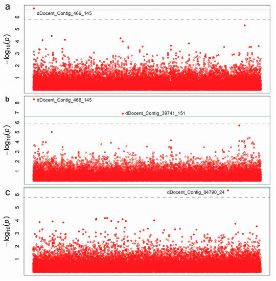 Manhattan plots representing association mapping for the 112 fenugreek genotypes using 38,142 SNPs of seed length (a), width (b), and color (c) arranged in random order (x-axis). The green horizontal solid line represents Bonferroni correction threshold at 6.5. The dashed gray line represents false discovery rate at 5.9.