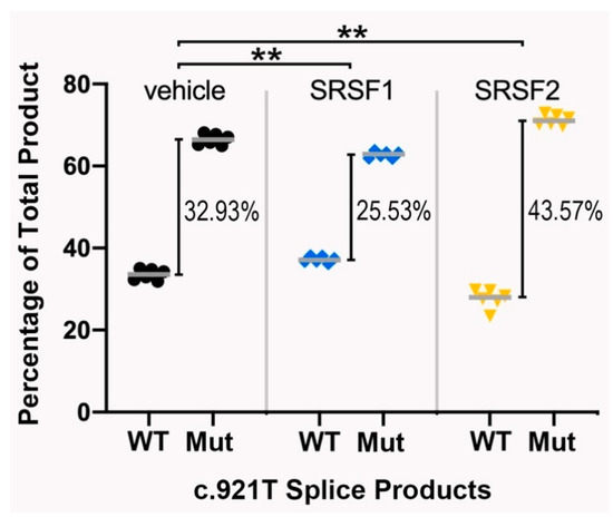The splice regulatory factors impact the extent of abnormal splicing caused by the synonymous IRF6 c.921C>T variant. The total amount of PCR splice products (WT: band 1, Mut: bands 2–4, as per Figure 2B) were quantified and expressed as a percentage of the total. Six replicates were performed. Statistical analysis was carried out using two-tailed Student’s t-tests; ** p < 0.05. Actual p-values from the tests are presented within the main text.