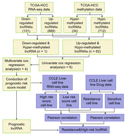 The expression data of lncRNAs were displayed as FPKM (fragments per kilobase of transcript per million mapped reads) and the expression level of each lncRNAs was normalizated by “EdgeR” package of R language for further analysis (EdgeR package, http://www.bioconductor.org/packages/release/bioc/html/edgeR.html). To obtain lncRNAs expression profile, we annotated lncRNA with the long non-coding RNA gene annotation file in GENCODE (Release 27). Next the differentially expressed lncRNAs were calculated by EdgeR (FDR (false discovery rate) < 0.05 and the absolute log2 FC > 1). The expression data set and DNA methylation data set were employed to identify the differentially expressed lncRNAs with altered methylation status. The flowchart of this study is shown in Figure 1. Firstly, EdgeR analysis was performed to identify the differential expressed lncRNAs (DELs) by comparing the normalized expression data between HCC and adjacent normal tissues. Next, we compared lncRNAs with altered methylation status from the TCGA data set and divided them into hyper-methylated lncRNAs and hypo-methylated lncRNAs (t-test, FDR < 0.05 and the absolute MTBeta-MNBeta > 0.3). These cutoffs and strategies were similar to those in previous studies [27,28]. Then we correlated the level of RNA expression with the degree of DNA methylation and in order to classify lncRNAs into two groups, hyper-methylated & down-regulated group and hypo-methylated & up-regulated group. LncRNAs of both groups were selected as candidate biomarker (MTBeta, MNBeta: β means of tumor samples and normal samples). Methylation levels were calculated as follows: We used the β value to estimate the methylation level of a given CpG probe. β value = Imeth/(Imeth + Iunmeth), where Imeth is the intensity of methylation and Iunmeth is the intensity of unmethylation [19,20].