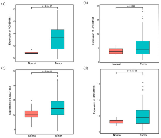 The expression of four hypomethylated lncRNAs in HCC and normal tissues. (a) AC025016.1, (b) LINC01164, (c) LINC01183; (d) LINC01269.