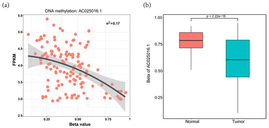 Example of a lncRNA driven by DNA methylation. (a) the AC025016.1 expression level (FPKM) was inversely correlated with its promoter methylation level (β value); (b) Boxplot showing that the β values of primary tumor samples were significantly higher than those of normal tissue samples.