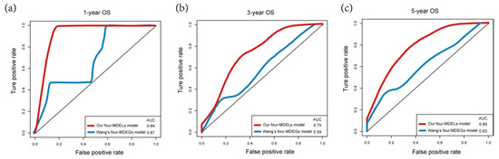 Comparison of our four-MDELs model and other literature model. The red and blue lines represent the ROC curve of the four-MDEL mode and Wang’s four-MDEG model respectively for (a) 1-year (b) 3-year (c) 5-year survival prediction.