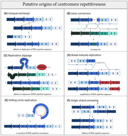 Mutagenic processes that may operate at centromere sequences and have contributed to their repetitive origins. (A) Unequal exchange following recombination can cause gain or loss of tandem repeats and DNA rearrangements. (B) Gene conversion causes the unidirectional transfer of genetic information among homologous repetitive DNA sequences and can result in reciprocal or non-reciprocal exchange (the latter is depicted). (C) Replication slippage on misalignment repeated DNA strands during replication is thought to induce centromere expansion or contraction depending on whether the hairpin (depicted)/distortion is found on the newly synthesized strand (blue repeats) or the bulge (depicted)/distortion is on the template DNA (green repeats). (D) Break-induced replication (BIR) repairs one-ended double-stranded break (DSB) substrate, produced by replication fork collapse. (E) Rolling circle replication occurs when the 3′ end circularizes, and its replication produces repeated concatemers. (F) Single strand annealing (SSA) repairs DSBs through the annealing of complementary ssDNA strands succeeded by DNA tail end digestion and ligation. These repair pathways are essential for maintaining genome stability, yet when operating on repetitive sequences (especially arranged in tandem and sharing high degree of sequence homology like at the centromere), they may result in mutagenic variability as a way for ongoing DNA evolution and shaping.
