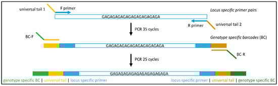 The grapevine cultivars were genotyped using SSR amplicon sequencing. The primers were redesigned to the length of the amplicon for short sequencing (~100 bp) (Table 2) and amplified according to the established protocol. For this purpose, two rounds of PCR amplification were performed (Figure 1) according to the protocols of Gohl et al. [29] and Vartia et al. [30]. The modified protocol consisted of amplification with locus-specific primers (forward and reverse) adapted to contain a universal primer sequence (Figure 1; Table 3), and the incorporation of two barcodes by two barcoded universal primers into both ends of the resulting amplicons. A total of 12 forward and 8 reverse DNA barcodes enabled the recovery of 96 unique individuals (Supplementary Material, Figure S1).