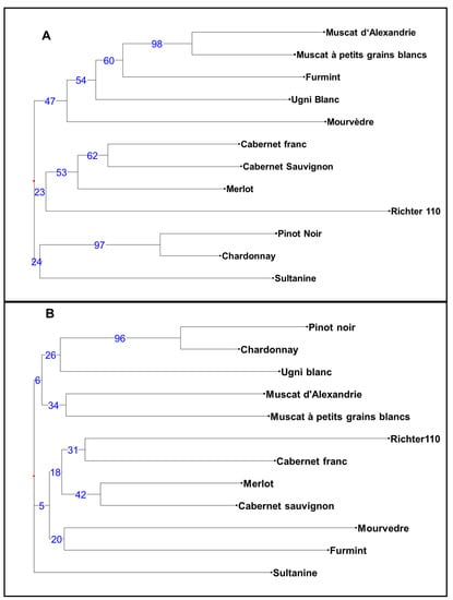 The clustering of cultivars based on simple-matching dissimilarity coefficients was performed for the CE and HTS allelic data and resulted in two trees (Figure 2), with bipartition complexities of 0.94 and 0.91. The value for the consensus tree was 0.52, and the obtained distance between the trees was 0.82. Certain clusters supported with high bootstrapping values (e.g., a cluster of Muscat cultivars and cluster of Pinot Noir–Chardonnay) appeared equally in both approaches, and the Richter 110 rootstock was the most different from other V. vinifera cultivars in both approaches (Figure 2).