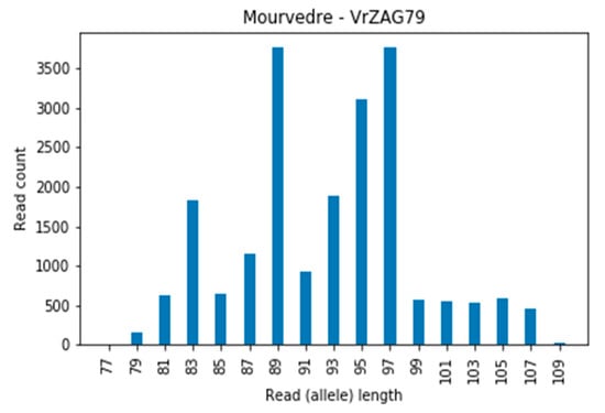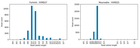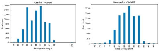 The minimum length of the amplicons demultiplexed by the locus ranged from 73 nt (VVIq 52 and VVIv37) to 99 nt (VVMD25), and the maximum length ranged from 85 nt (VVIq52) to 131 nt (VVMD25), corresponding to the allele lengths shown in the Supplementary Material, Figure S2.