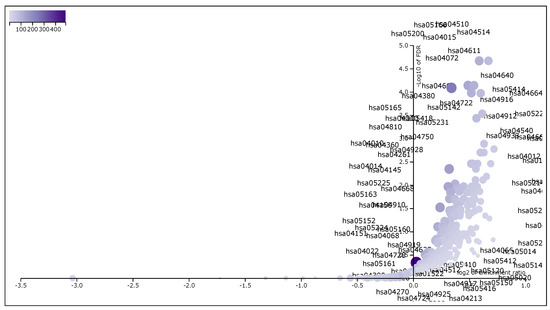 The volcano plot of normalized enrichment score of the FDR significant KEGG pathways from GSEA analysis of DEGs.