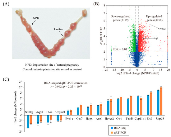 Identification of changed genes in natural pregnancy decidualization (NPD). (A) A photograph showing the mouse uterus from day 8 of natural pregnancy. (B) Volcano plot showing the comparison between the implantation sites of natural pregnancy decidualization (NPD) and the non-decidualized inter-implantation sites (control) in mice. The cutoff values for differentially expressed genes were: fold change ≥2 and FDR ≤ 0.01. Red, green, and blue colors are indicative of up-regulated genes, down-regulated genes, and non-changed genes, respectively. (C) Validation of a panel of selected genes by using qRT-PCR. Data obtained from qRT-PCR were displayed as mean ± SEM (standard error of mean). According to the t-test, p < 0.05 is true for all genes. n = 3.