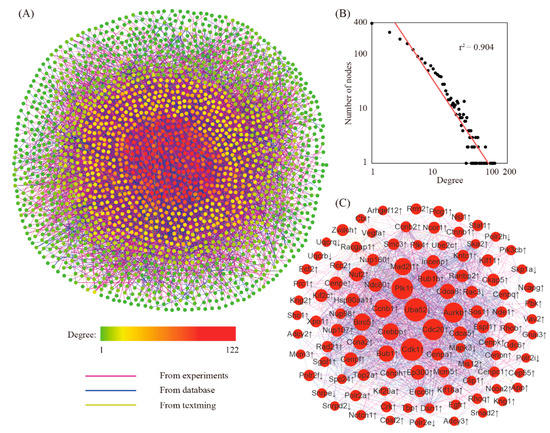 The network for differentially expressed genes was created by using the STRING online tool. The reconstructed network had 2114 genes with 9987 edges (Figure 3A). Further analysis showed that this network was a small-scale network with some high connected nodes known as hub genes (Figure 3B). Within this network, we found a total of 104 hub genes (Figure 3C). Because of their key positions in the network, these hub genes are supposed to be more important than the others.