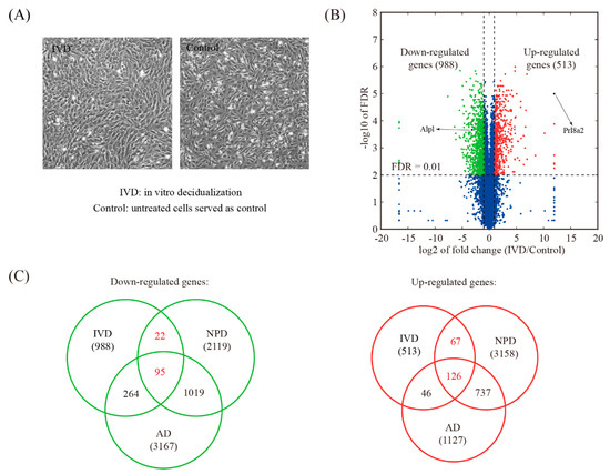 Identification of changed genes in the in vitro decidualization (IVD) model. (A) A view of morphological changes in cultured endometrial stromal cells during the IVD process. (B) Volcano plot showing the comparison between IVD and control. The threshold values for differentially expressed genes were: fold change >2 and FDR < 0.01. (C) Venn diagram showing the overlap of down-regulated genes and up-regulated genes and between the NPD model, the AD model, and the IVD model.