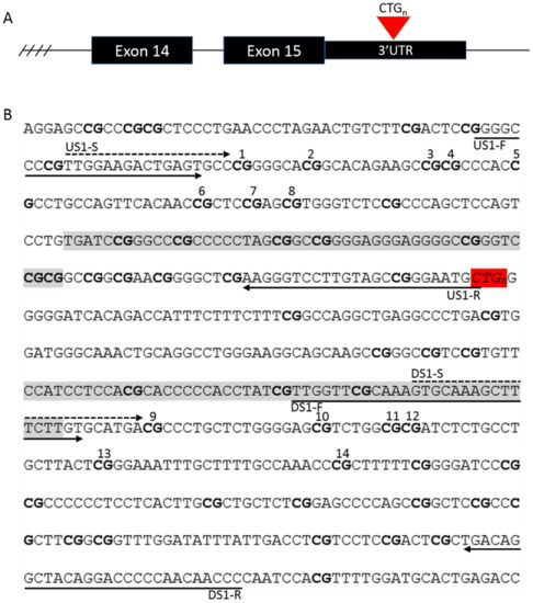 The location of (A) the CTG repeat in the DMPK gene and (B) the primers and the CpG sites investigated in this study. CpG sites 1–8 are located upstream and CpG sites 9–14 are located downstream of the repeat. CpG sites are marked with bold, the CTG repeat is marked with red, and CTCF binding sites flanking the repeat are marked with grey. PCR primers are marked with solid lines, and pyrosequencing primers, with dashed lines.