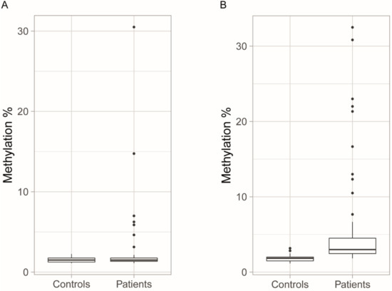 Mean methylation levels of all the CpG sites (A) upstream and (B) downstream of the CTG repeat. In approximately 10% of the patients, the upstream CpG sites were hypermethylated compared to in the control group, while the methylation levels of downstream CpG sites were significantly higher in patients than in controls. Boxplots indicate medians and quartiles, and the dots indicate the levels of methylation for patients who are outliers.