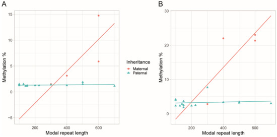 We observed a positive correlation between the repeat length and upstream/downstream methylation levels, as reported previously [4,19,20]. When we evaluated the repeat length versus methylation levels among the patients with known parental inheritance of the disease allele, the patients with paternal and maternal inheritance had a tendency to cluster, and the methylation levels in patients with paternal inheritance did not correlate with the repeat length (Figure 3). However, our observations were limited by a number of factors. We had repeat length information for less than half of our patient cohort, and the modal repeat length was measured using different methods. Furthermore, we did not have knowledge of the parental inheritance of the disease allele for every patient. Larger studies may give better insight into this aspect.