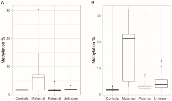 Methylation levels grouped by maternal, paternal, or unknown inheritance. (A) Increased methylation of the upstream CpG sites was mainly observed in patients who had inherited the disease allele maternally, while the methylation levels of the patients who had inherited the allele paternally were comparable to those of the controls. (B) Increased methylation of the downstream CpG sites was observed in the majority of patients compared to controls, with higher degrees of methylation seen in the patients who had inherited the disease allele maternally. Boxplots indicate medians and quartiles, and the dots indicate the levels of methylation for patients who are outliers.