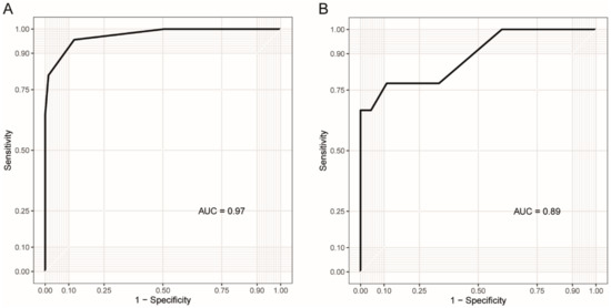 Receiver-operating characteristic (ROC) curves illustrating how methylation at downstream CpG14 can be used as (A) a biomarker for DM1 and (B) to identify patients with maternal transmission of the disease allele. The y-axis shows the rate of true positives, while the x-axis shows the rate of false positives. AUC = Area under the curve.