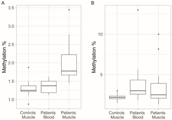 Methylation levels of the CpG sites in the blood and skeletal muscle of DM1 patients compared to controls. (A) Increased methylation of upstream CpG sites can be observed in the muscle tissue of patients compared to in the blood of patients and the muscle tissue from controls. (B) There was no significant difference in the methylation levels of the downstream CpG sites between the blood and muscle tissue of the patients, and muscle tissue of the controls. There was, however, larger variance in the methylation levels of the downstream CpG sites, and the outliers were values for patients with repeat interruptions. Boxplots indicate medians and quartiles, and the dots indicate the levels of methylation for patients who are outliers.