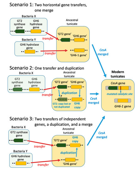 The foregoing finding raised the question of how the tunicate ancestor acquired the precursor of the CesA-GH6 and GH6-1 genes. Three possible evolutionary scenarios have been proposed (Figure 1) [10,14]. Scenario 1: Two GH6 genes were transferred, one of which merged with a GT2-containing gene from the same prokaryote genomic region transferred to an ancestral tunicate and formed the tunicate CesA gene. The second GH6-gene gave rise to the current GH6-1. Scenario 2: A GH6 gene was transferred and duplicated. After a single transfer of prokaryote GT2-GH6 region into a tunicate genome, a duplication occurred. One copy did not include or retain the GT2 part and became GH6-1, while the other copy (an ancient ‘GH6 gene’) merged with the GT2 domain and became part of tunicate CesA (joined GT2-GH6 domains). Scenario 3: A GT2-gene and a GH6-gene transferred independently into an ancestral tunicate. The GH6-gene duplicated thereafter. One copy of the GH6 gene fused with the GT2 gene to form the tunicate CesA gene. The other copy remained an independent GH6-1 gene.