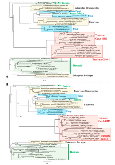 Nonetheless, our analyses failed to determine the relationship of tunicate sequences among other GH6 proteins. Although in these trees, tunicate sequences were clustered with many fungal GH6 proteins, some other eukaryotic GH6s (from red algae (Rhodophyta), Haptista, and the SAR supergroup), and a proteobacterial GH6 (YP_001618727.1, Sorangium cellulosum), the Bayesian posterior probability (Figure 2A) and ML bootstrap support (Figure 2B) for this clustering were low. Notably, branches leading to tunicate sequences were longer than branches to other sequence clusters.